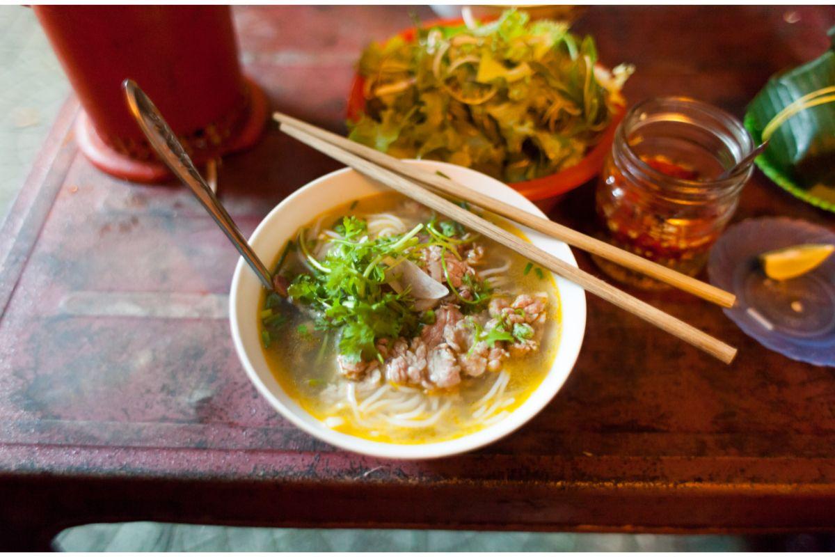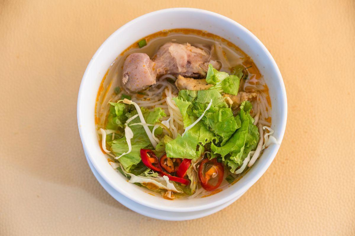 Il Bun Bo è una delle zuppe di noodle più popolari di Hue. Si prepara con sottili tagliatelle di riso, fettine di manzo e grossi pezzi di stinco di manzo.