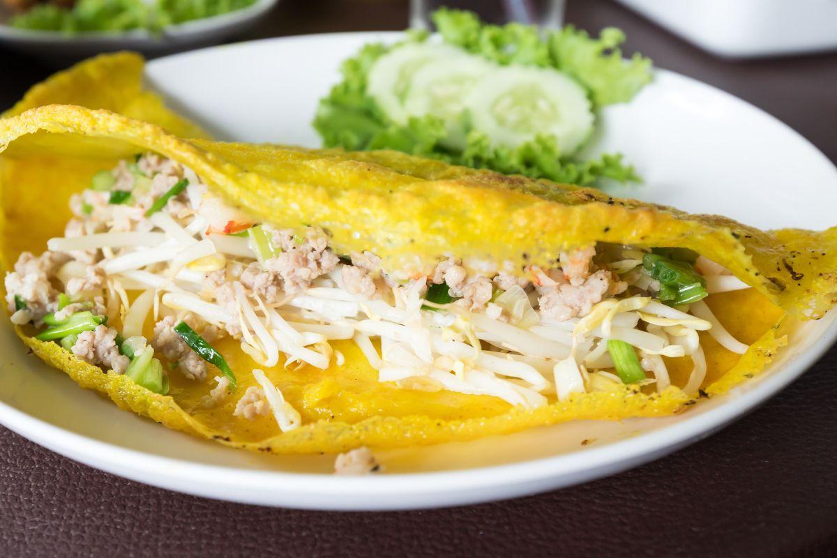 Il Banh Xeo è una frittella croccante a base di farina di riso fritta e ripiena di gamberi, manzo, cipolle verdi e germogli di fagioli.