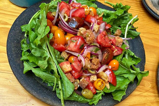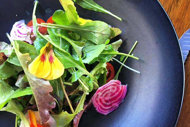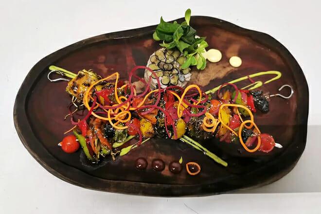 Il menu su lavagna cambia ogni giorno e la cucina a vista alimentata a energia solare e il forno a legna servono ad accentuare i piatti deliziosi.
